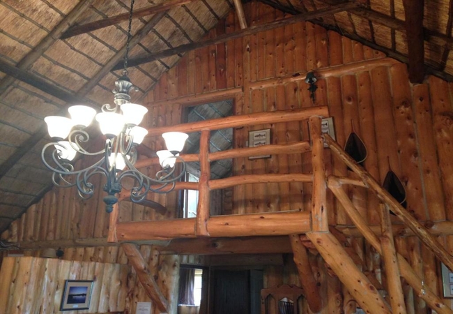 Rustic open wooden staircase with balustrade lead to the loft bedroom with stunning views over Willowbrooke Dam. Enjoy your meals in the open plan living area under a vaulted thatched roof or on the patio.