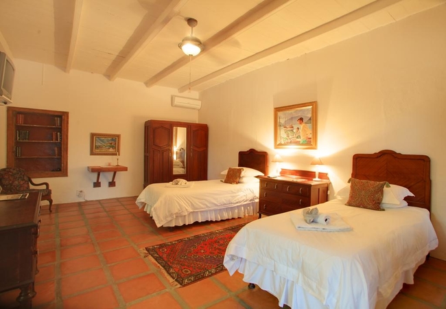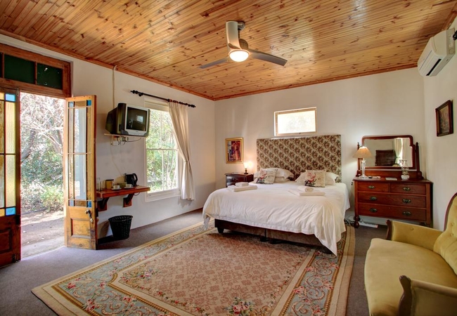 This en-suite garden cottage with its own private entrance, is furnished with twin beds (two singles). The en-suite bathroom is equipped with a bath, toilet and hand basin. Other facilities in the cottage include TV with DSTV, electric blankets, fans, air-conditioning, tea and coffee making facilities.