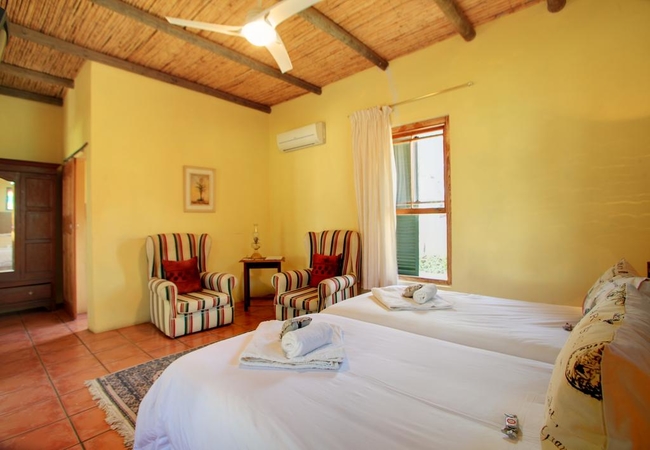 This Twin Cottage has its own private entrance and is furnished with two single beds. The en-suite bathroom is equipped with a shower, toilet and hand basin. Other facilities in the cottage include TV with DSTV, electric blankets, fans, air-conditioning, tea and coffee making facilities.