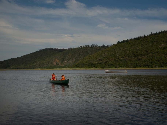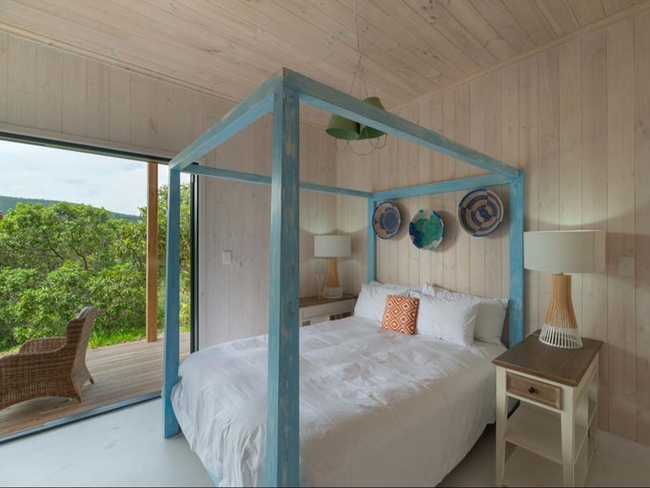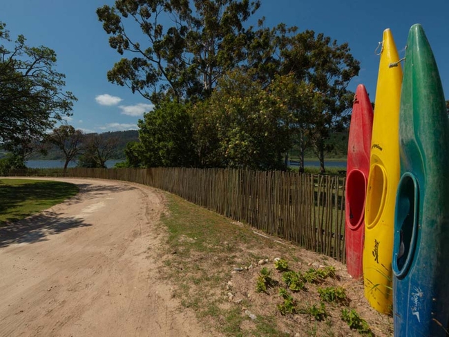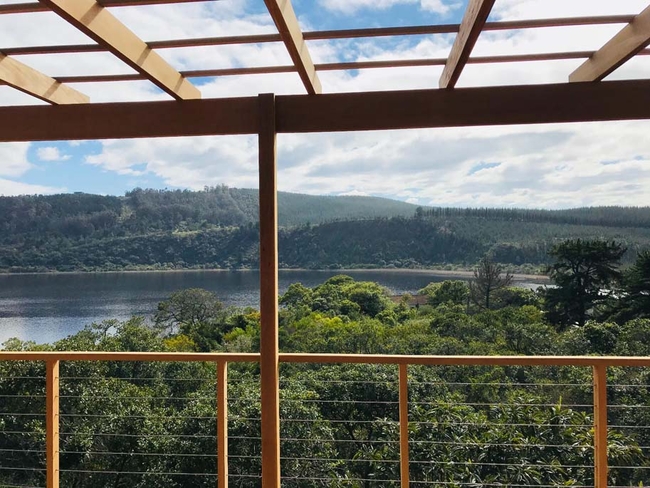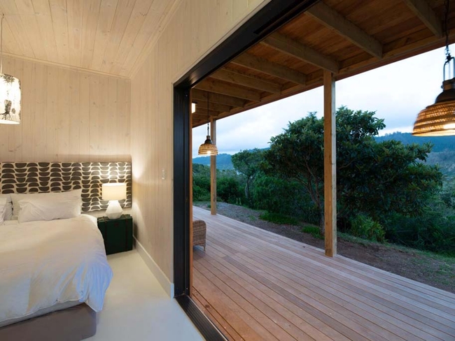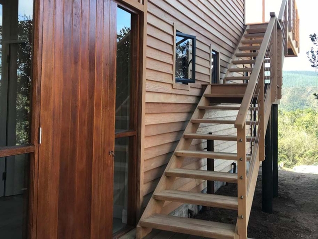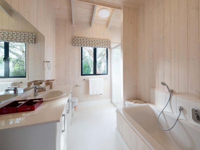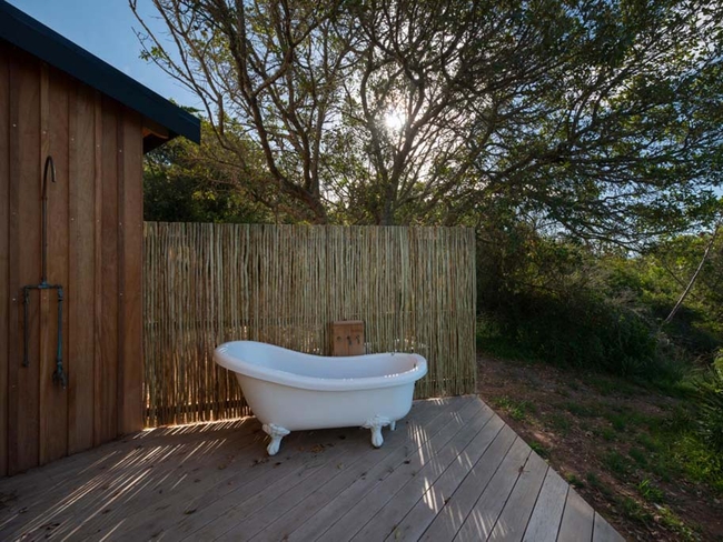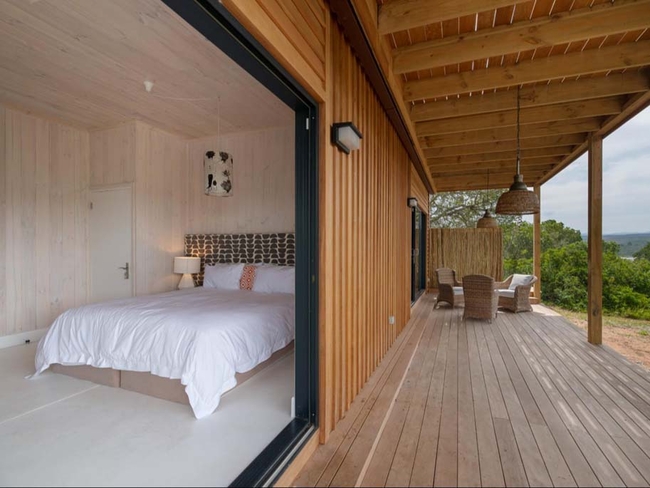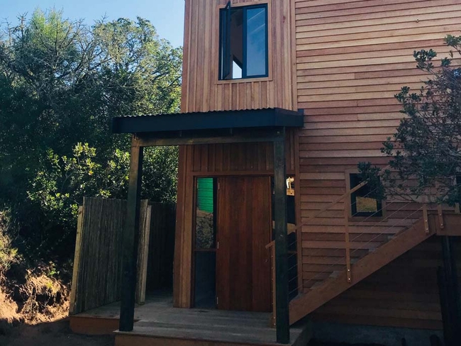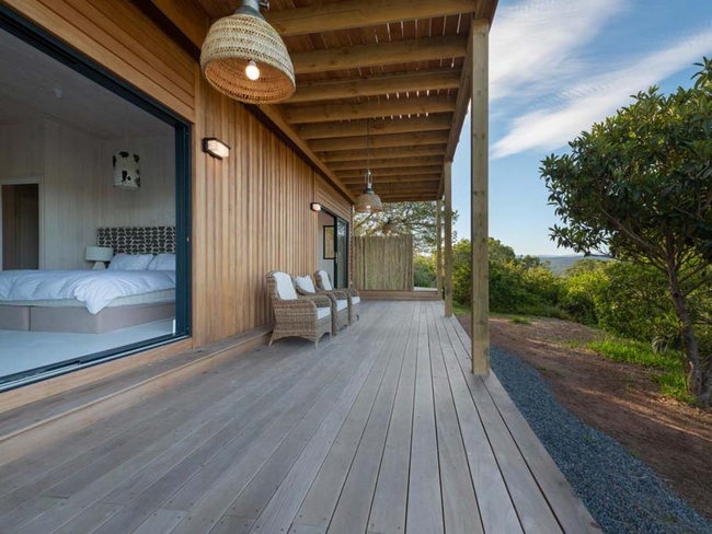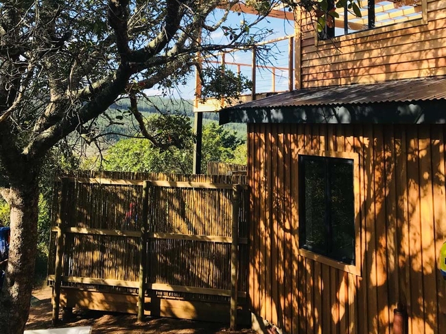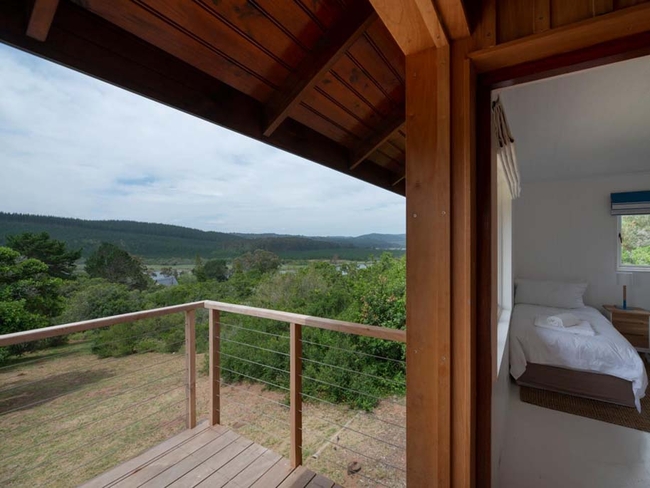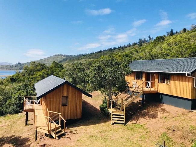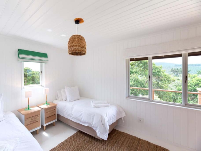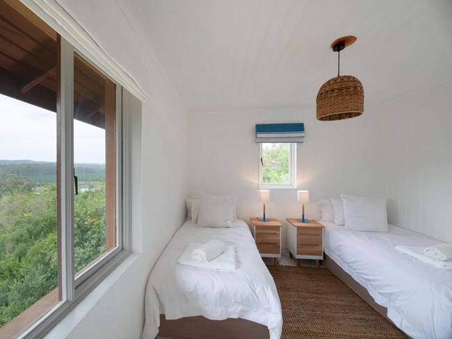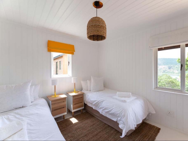 The double-storey main house has 180-degree views from the main deck and an open-plan kitchen, living room, and dining areas. The house can accommodate 4 adults and 4 children, and in addition, there are 2 2-bedroom timber cabins for an additional 8 guests. The spacious main house is split between 2 floors, with 3 en-suite bedrooms on the ground floor and an open-plan kitchen, living room, and dining room on the first floor. The length of the upstairs opens to a 4-meter-wide deck through sliding doors, making it a perfect space for inside and outside living. There are 2 equal-sized en-suite bedrooms with sliding doors opening onto the deck. One of the rooms has a queen-size 4-poster bed, and the other has a super-king-size bed, which can be converted into twin beds. Behind a screen, an outdoor bath and shower are on the deck, under the canopy of a milkwood tree. The third bedroom has 2 bunk beds for 4 children, an en-suite shower and basin, and access to the guest restroom by the stairs. All rooms have floor fans, and a laundry room is available. Each of the timber cabins has 2 bedrooms with floor fans and shares a bathroom with a shower, basin, and loo in between the bedrooms. The beds can be made up of a king-size bed that can be converted into twin beds on request. The access is up some steps to a landing, and the cabins are 20 metres from the main house. The first-floor open-plan living area in the main house was designed to capture the outstanding views of the site overlooking the indigenous vegetation, river, and lagoon. Large sliding doors open onto a partially covered outside deck. The inside has seating around a dining room table for 14. The kitchen is fully equipped with Le Creuset appliances and cookware. The kitchen island has a gas hob and oven and 3 bar stools. In the cosy living area is a wall-mounted television with access to Netflix. Wi-Fi access is available.