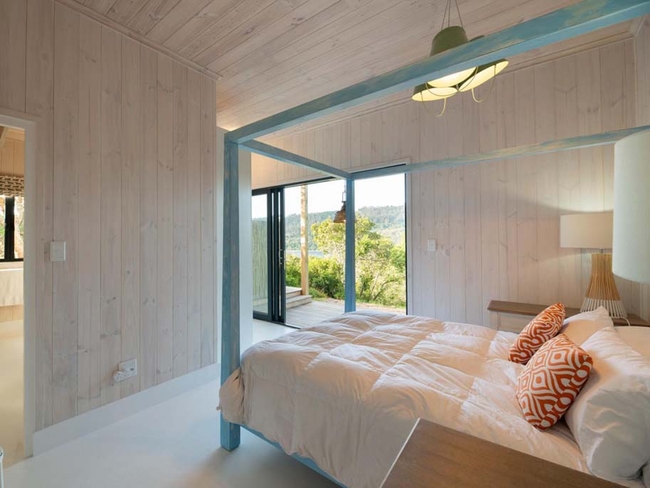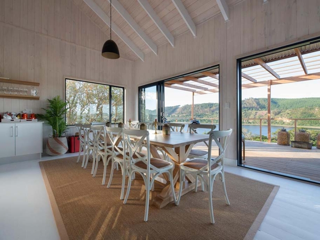 The open-plan first-floor living space in the main house has been designed to capture the panoramic views of the river, lagoon, and surrounding indigenous vegetation. Large sliding doors lead to a partially covered outdoor deck, where guests can dine and relax. Indoors, the dining area seats up to 14 guests, and the fully equipped kitchen includes Le Creuset appliances, a gas hob, an oven, and an island with three bar stools. The living area features a wall-mounted television with Netflix and Wi-Fi access.