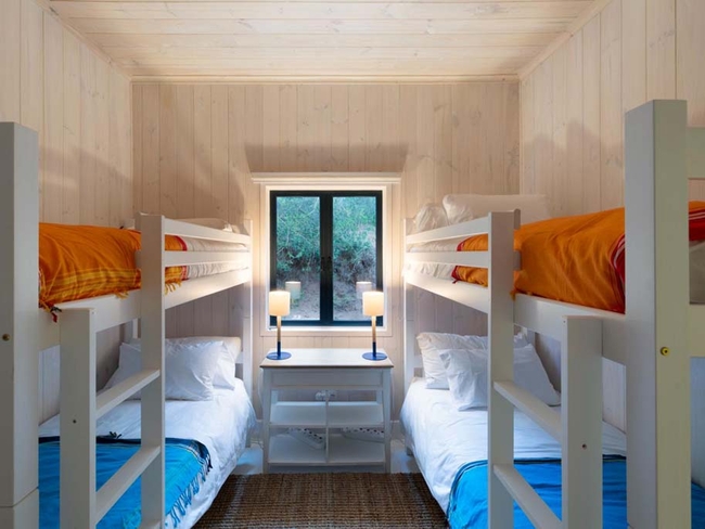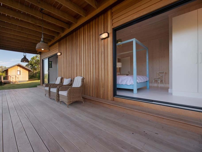 The two timber cabins, each featuring two bedrooms, are located 20 meters from the main house. Each cabin includes a shared bathroom situated between the bedrooms, fitted with a shower, basin, and toilet. Both cabins offer flexibility in sleeping arrangements, with beds that can be converted into either a king-size bed or twin beds upon request. The cabins are accessed via steps leading to a small landing.