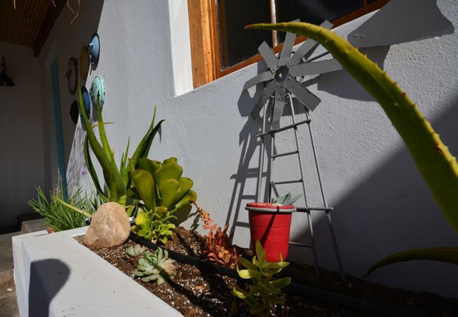 Windpomp at Ta Mala's is decorated in cool shades with a rustic feel and has the original Glenwood delux woodburning stove to ensure warm cosy nights even during our cold winters. The bedroom is furnished with a double bed and the bathroom is fitted with a bath, shower, toilet and basin. There is an open plan living area with a sleeper couch, air-conditioning, a TV and DStv, Wi-Fi and a fully equipped kitchen containing everything needed for your self catering stay. It has a lovely private entertaining area with braai facilities and views of the indigenous garden. It has a private entrance off Nuwe street with safe undercover parking.