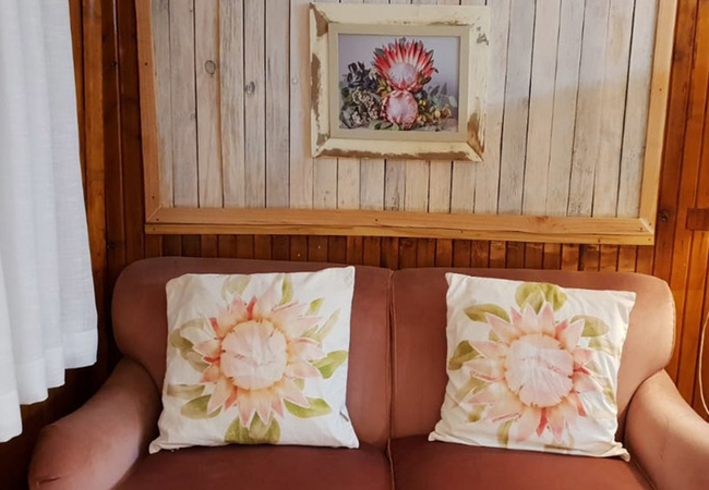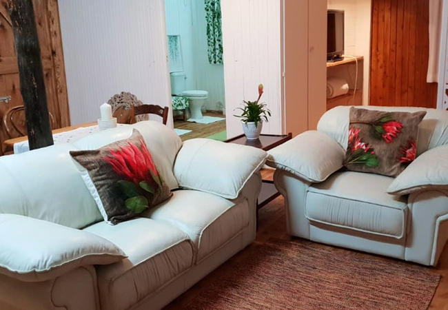 The cosy living area, which opens onto a private verandah, is furnished with a comfortable sleeper couch for a child, a fireplace and a TV with DStv / satellite channels. The fully equipped kitchen is perfect for self catering and includes a microwave, stove, toaster, fridge / freezer, kettle and ironing facilities.