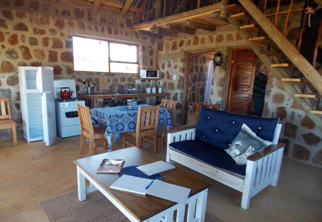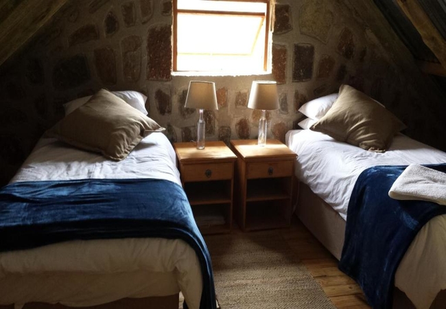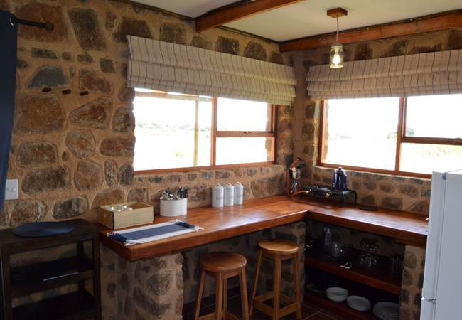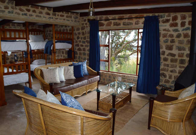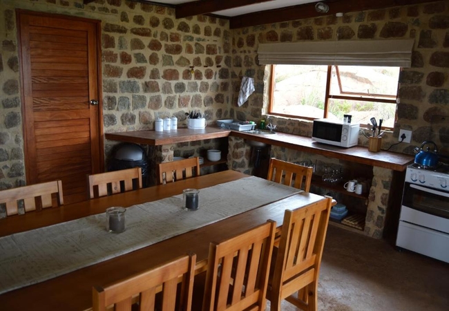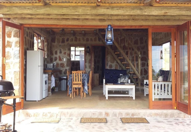 Blue Dunn Cottage is a large stone cottage with two bedrooms furnished with either a King-size or two single beds. In addition there are two bunk beds in an alcove off the lounge. The lounge, dining and kitchen area is open plan and there are braai facilities on the patio. The bathroom has a bath and shower.