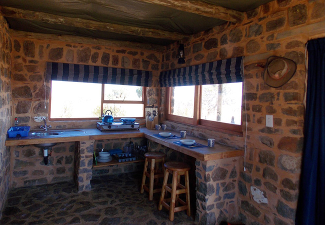 Half Hog Cottage is a cosy little cottage that sleeps two guests in an open plan sitting, sleeping and kitchenette area. The bathroom has a bath and an overhead shower. There is a fireplace and a patio with views over the dams. Braai facilities are provided.