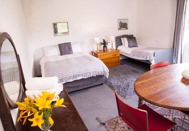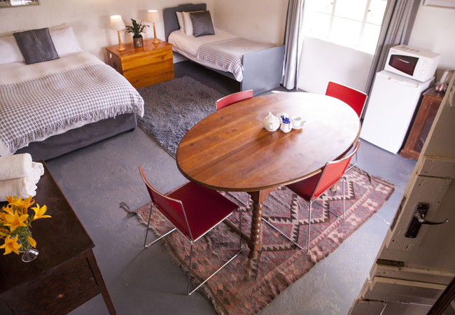 A rustic single-roomed self-catering unit in the Zonnenstrahl campsite, sharing the ablution block.This unit sleeps three guests. It is furnished with a double bed and a single bed. The unit only has a kettle and fridge, microwave and dining table, but you are welcome to use the campsite kitchen facilities.