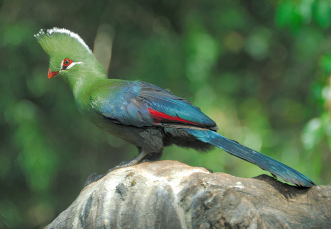 The Knysna Lourie (also known as Knysna Turaco) is a large green bird with a short hooked bill and brilliant red wings. The Knysna Turaco is foun...