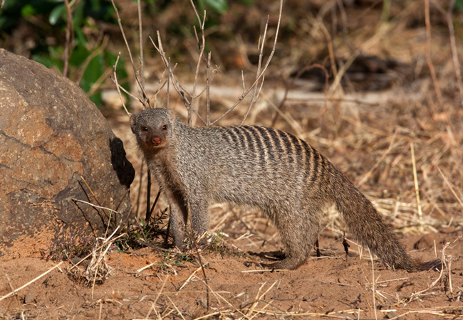 The banded mongoose is stocky and sturdy with a tail that is bushy and is practically as long as its body. Its grey-brown coat is thick and is characterised by bold black or dark brown stripes that run horizontally across the back.