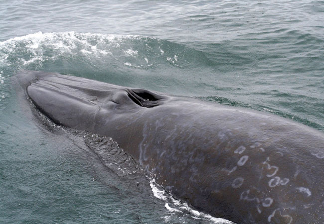 What makes this whale identifiable to those with a keen eye is the three ridges that run longitudinally and parallel to one another along the top of the whale's head. These are at the same level as the two blowholes. Because this is a baleen whale, it needs to expand its mouth when swallowing large amounts of water. For this, it has grooves along the lower jaw, which allow it to concertina open and closed more effectively.
