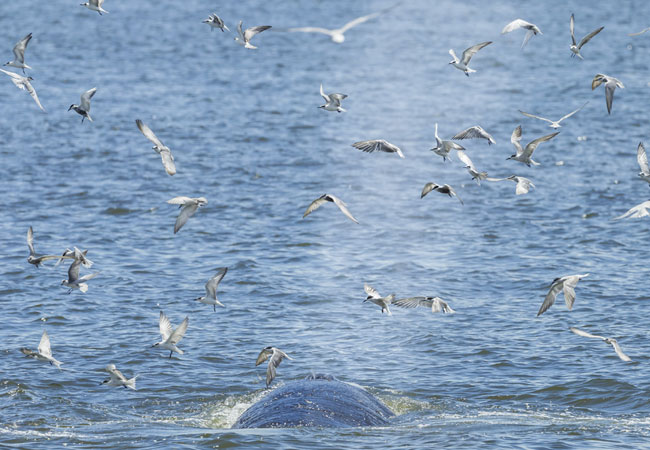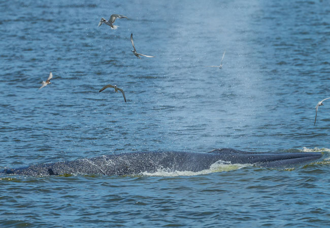 The Bryde's Whale has between 250 and 365 baleen plates in its ample jaws. These are hair-like structures that sieve the water and trap small fish and krill in the plates. They do this in a dramatic series of lunges into schools of prey, their mouths gaping with impressive scale.