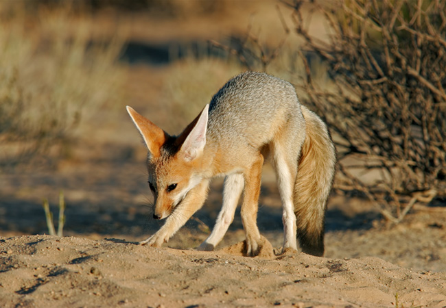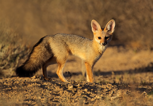 These foxes have silver colouring on their backs, while their flanks and bellies are yellow. They are characterised by a long bushy tail, which is mainly brown with a black tip. This colouring stands the Cape fox in good stead in terms of camouflaging itself in the African savannahs. The legs are long and slender and the ears are large and pointed.