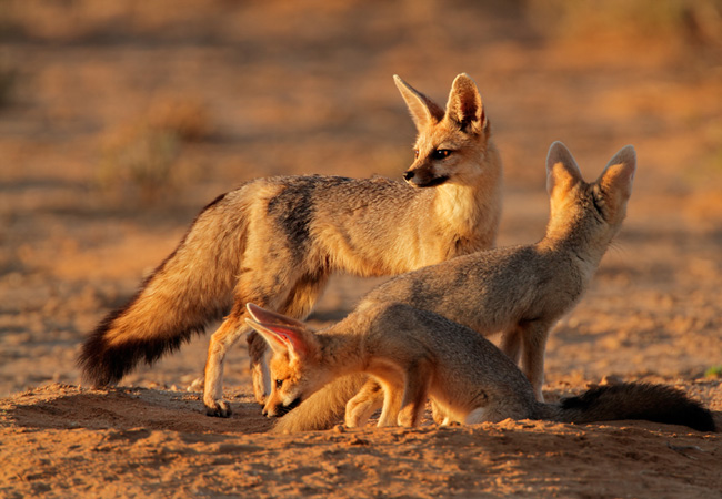 Both parents are responsible for feeding and protecting the cubs, which are weaned at between 6 and 8 weeks. The little ones stick close to their mother until they are 4 months old, when they emerge from the burrows and start to go out foraging with her. Only a month later, they become independent of her and begin to live their adult life. If not, they will be evicted from the ‘home' when new pups are on their way. The Cape fox reaches sexual maturity at only 9 months of age.