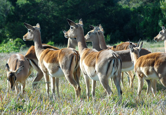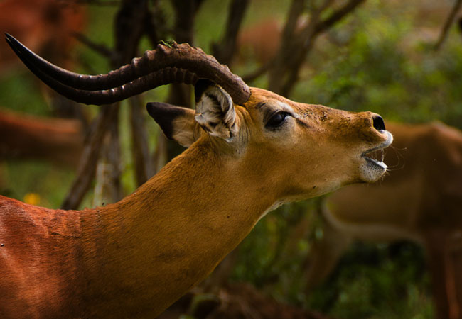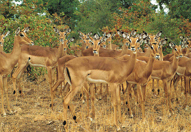 The graceful impala is a slender, medium-sized antelope so adaptable that it is found from southern Africa to the northern limits of East Africa. The body is reddish-brown with white hair inside the ears, over each eye and on the chin, upper throat, underparts and buttocks.