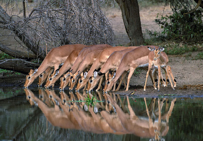 Grazers and browsers, Impalas eat tender young grass shoots in the wet season and herbs and shrubs at other times. During the dry season they drink daily.