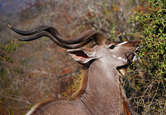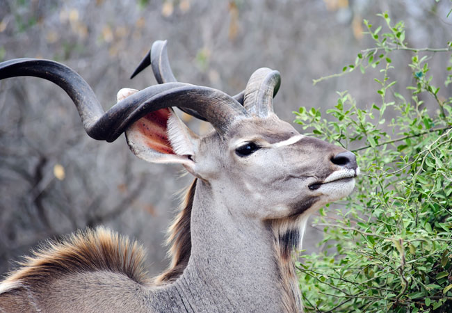 A browser, the Kudu eats many kinds of leaves, herbs, fallen fruits, vines, tubers, succulents, and flowers, sometimes varied with a little new grass.