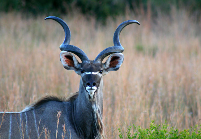 The greater kudu's horns are spectacular and can grow as long as 72 inches, making 2 1/2 graceful twists.