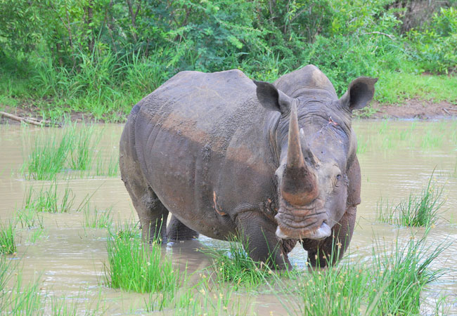 The White Rhino: The white rhino's name derives from the Dutch "weit," meaning wide, a reference to its wide, square muzzle adapted for grazing. The white rhino, which is actually grey, has a pronounced hump on the neck and a long face.