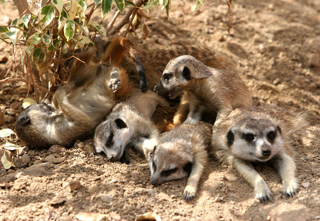 Suricate (Meerkats) are diurnal. They live in colonies of up to 30. The groups consist of 2-3 family units comprising a male, a female and their 2-5 young. They usually inhabit the burrows of ground squirrels, which they enlarge by digging with their sharp claws. When emerging from their burrows in the early morning, they tend to sunbathe before spending the day foraging for small prey.
