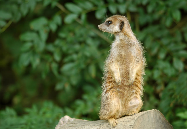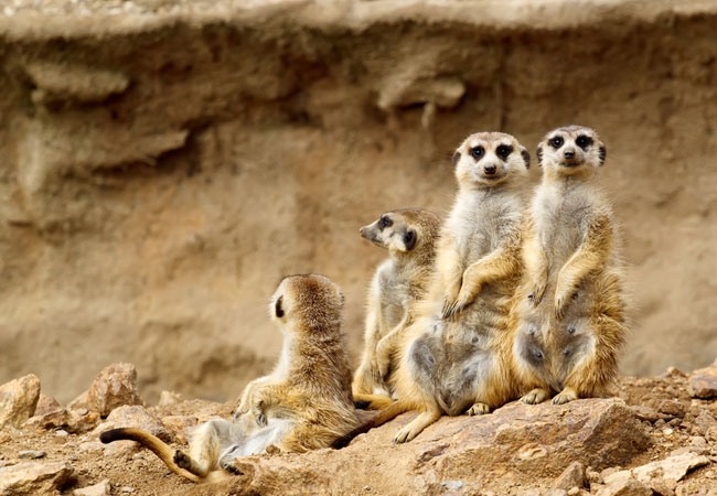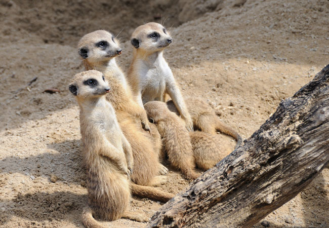 Adults take it in turns to stand on sentry, finding a convenient vantage point where they can watch for predators, such as eagles. If danger is sighted, the sentry gives a warning bark, and the meerkats flee to the safety of their burrows. If the threat is a snake, the adults will huddle together and drive the predator away. While sentries keep watch, other meerkats take care of the young.
