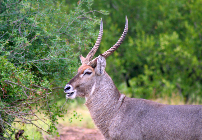 Only the males have horns which are handsome, long and prominently ringed, sweeping backwards and up. The eyes and nose of the Waterbuck have beautiful white markings and it has a noticeable white collar under the throat line.